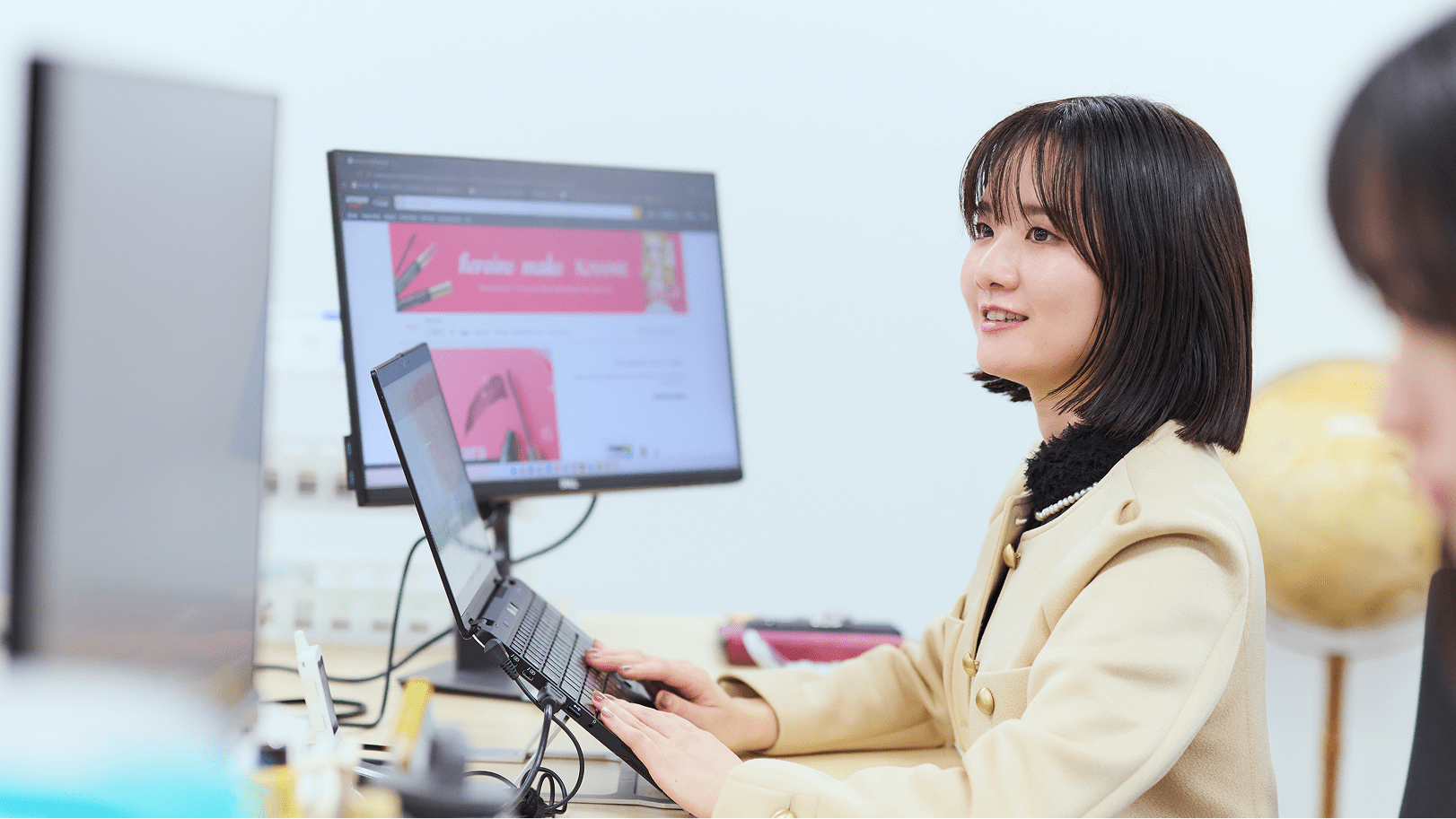 海外営業戦略の業務では、海外市場におけるブランド方針の立案、その達成に向けた行動目標や年間予定の策定、提案書の作成などを行っています。国によってブランドの立ち位置や外的要因も異なる中で、どのようにKISSMEのブランド価値を高めるか、商品認知とシェアを拡大するかを検討し、各国営業担当と連携しながら提案を行います。