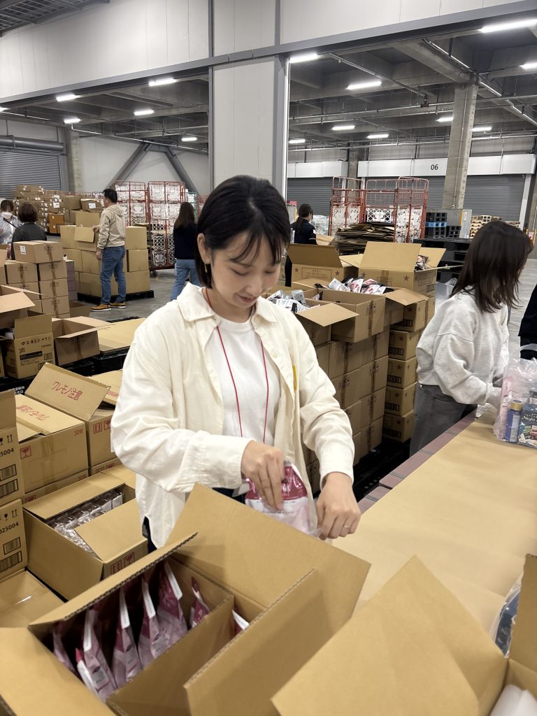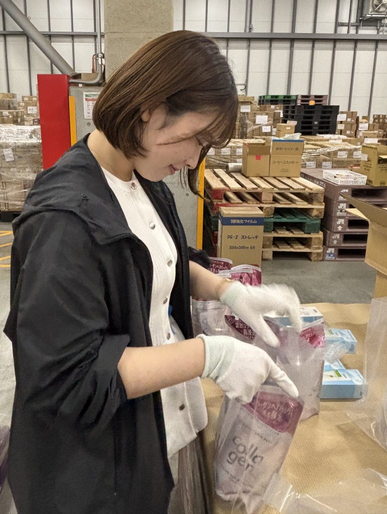 お寄せいただいた商品はコスメバンクプロジェクトのスタッフや各社からのボランティアにより丁寧に梱包してお届けされます。伊勢半からも梱包作業のお手伝いを行いました!