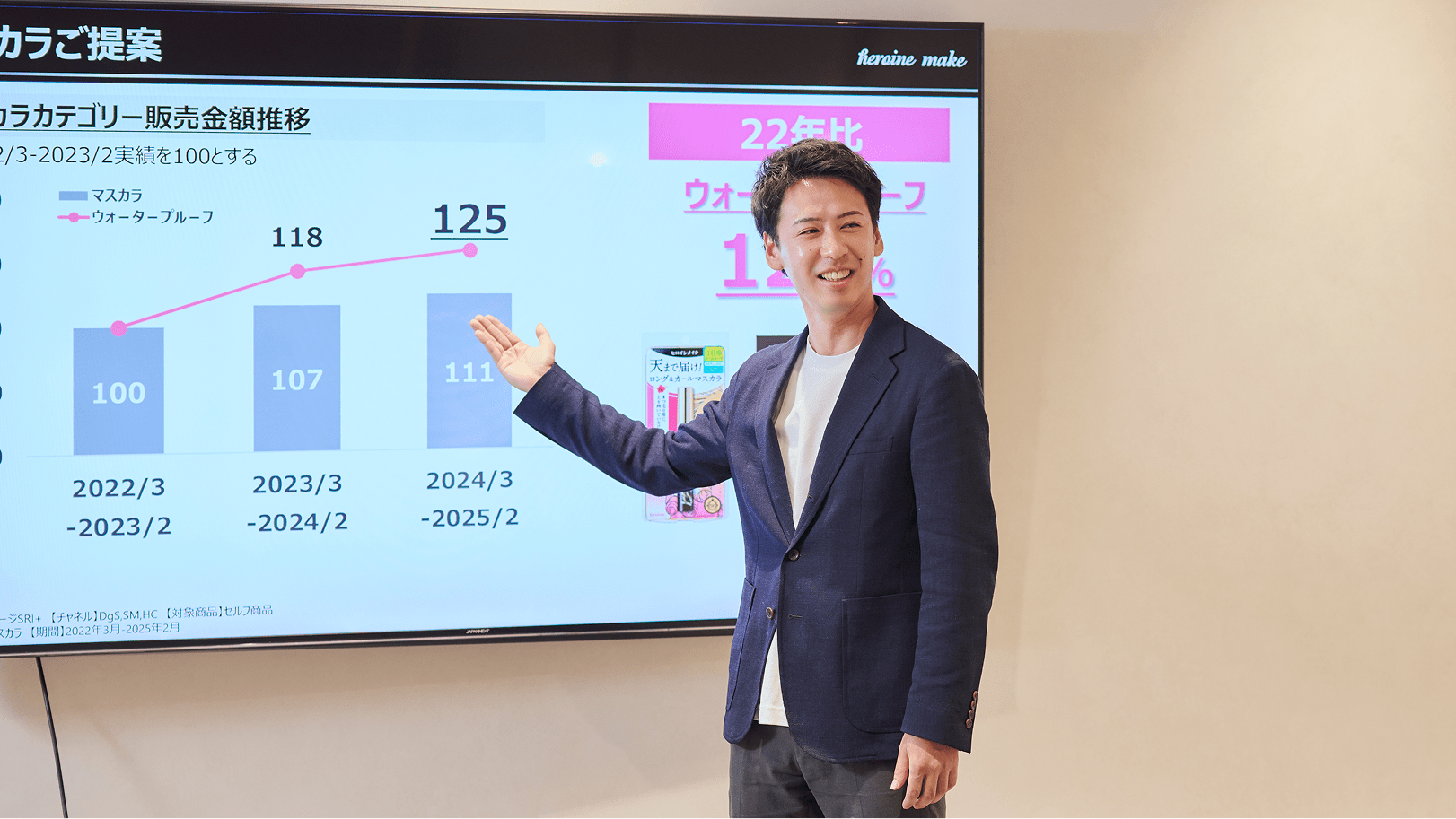 化粧品会社のため、提案の面で女性に比べて男性は不利な点が多いと入社前は思っていましたが、全くそんなことはありませんでした。もちろん化粧品に関する知識は自身でも勉強する必要はありますが、提案資料の作成時にはサポートもしてもらえるので、メイクに詳しくなくても活躍できる場があると感じています。